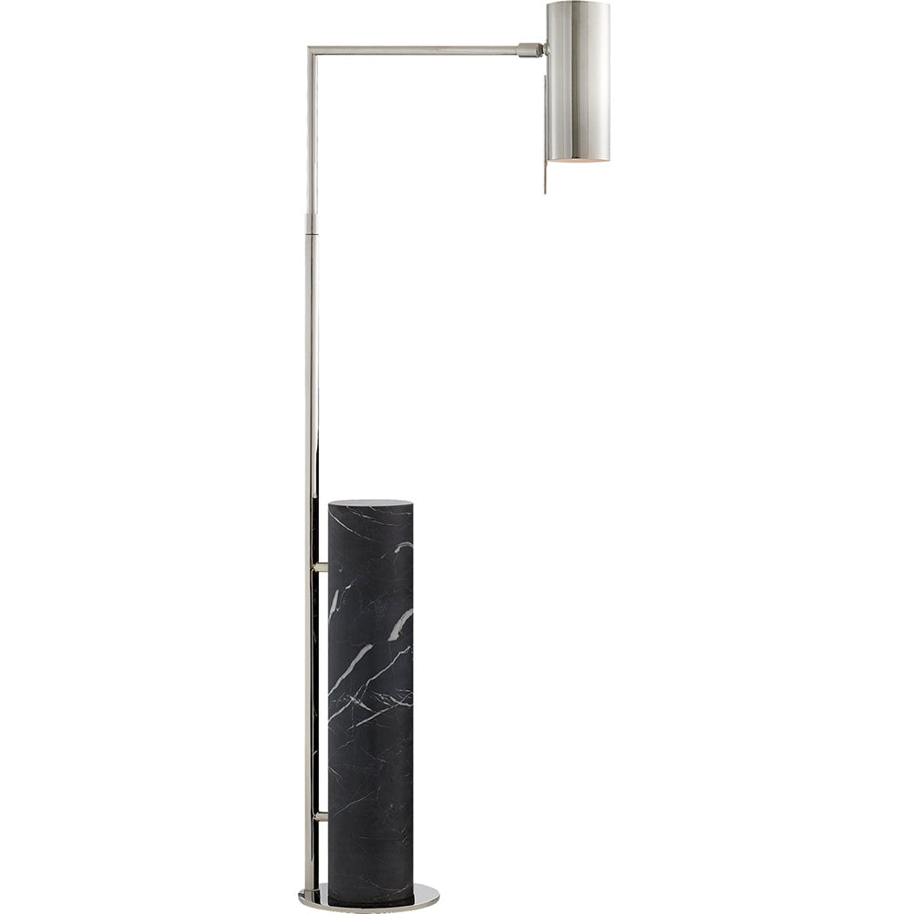 Alma Floor Lamp by Kelly Wearstler is minimalist pharmacy floor lamp in Burnished brass or Polished Nickel that is as functional as it is beautiful. The tubular shade on the adjustable arm hovers above a base of cylindrical marble. The Alma Floor Lamp by Kelly Wearstler rotates 40 degrees, 20 degrees both left and right of center so you can easily position it over you as a reading lamp. To further aim the lamp, use the handle on the shade, which can also pivot 180 degrees up and down. The fabric wrapped cord has an easy on/off switc