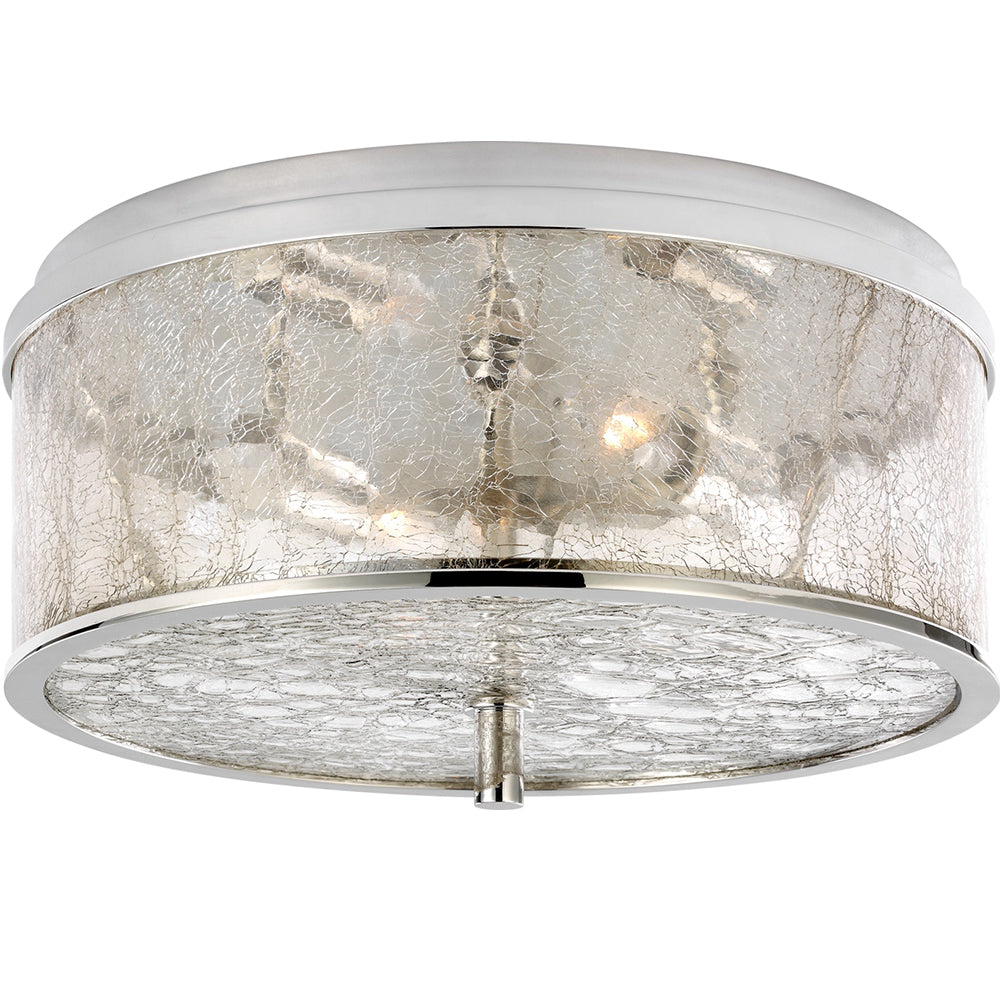 Liaison Medium Flush Mount by Kelly Wearstler blurs the lines of modern and classic with its clean architectural metal detailing and the dynamic beauty of the fractured glass. This ceiling fixture is appropriate for both indoor and covered outdoor spaces and is available in Bronze and Antique Brass.