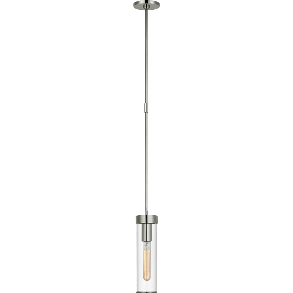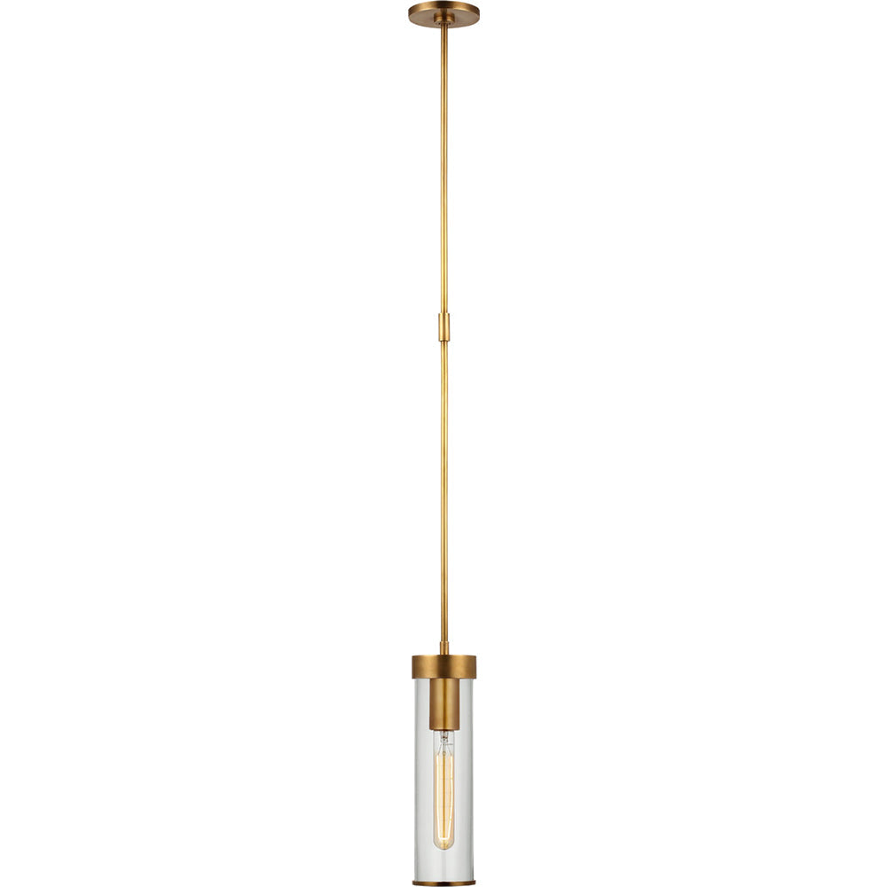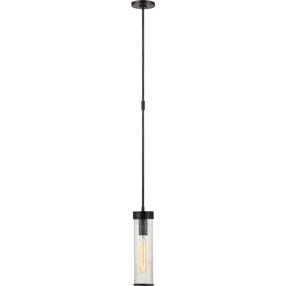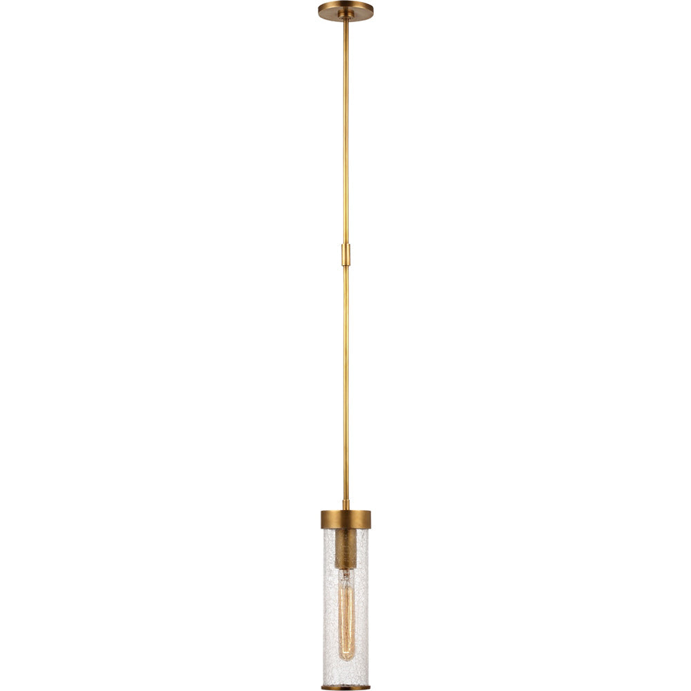 This cylindrical pendant light features our signature crackle glass housing a single candelabra base bulb. The crackle glass shade is framed in brass and hangs from a brass canopy. The mix of clean and raw finishes give this pendant a distinct modern feel.Liaison Short Pendant by Kelly Wearstler is available in Antique Burnished Brass, Bronze, and Polished Nickel with Crackle Glass.