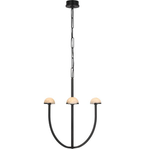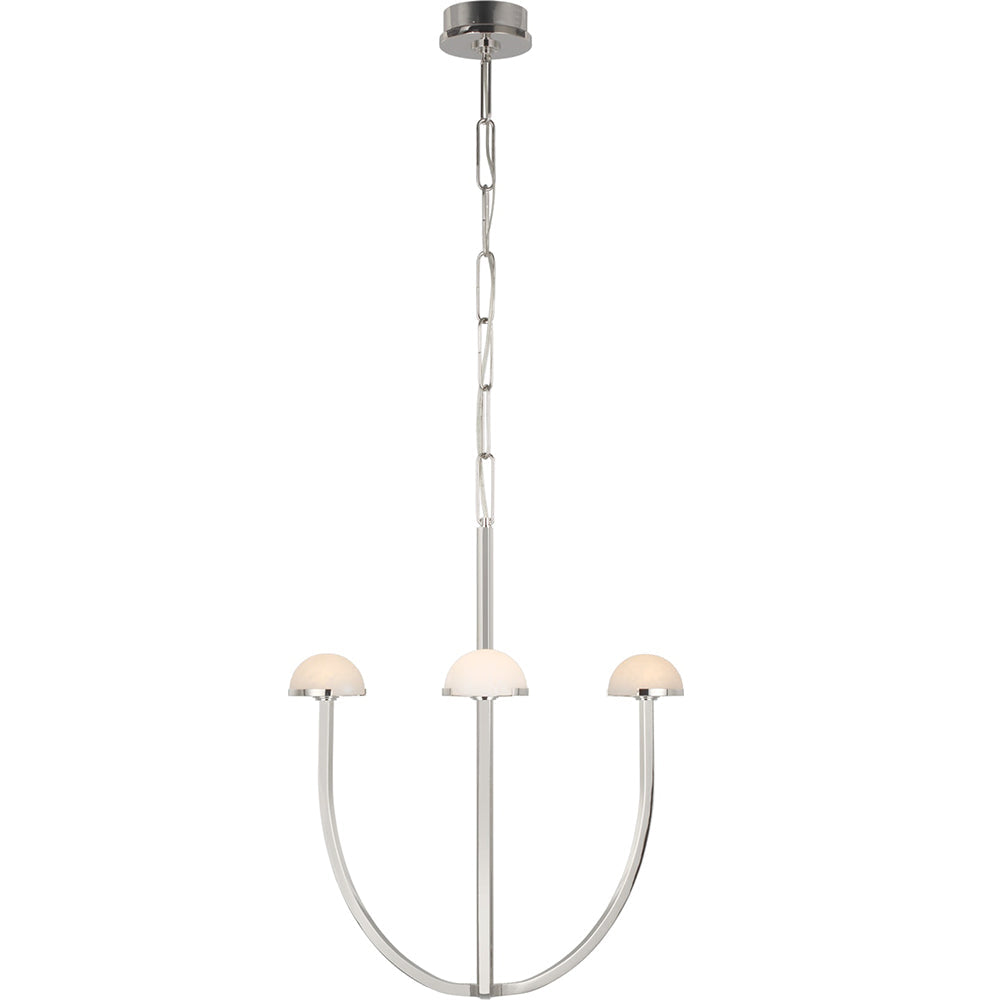 A parallax of dramatically curving silhouettes, the Pedra Medium Chandelier is the paradigm of versatile ambiguous design. This hanging chandelier features hand-carved domes of natural Alabaster accentuated by curvilinear arms of Antique Burnished Brass, Bronze or Polished Nickel, all suspended by a matching custom-link metal chain.