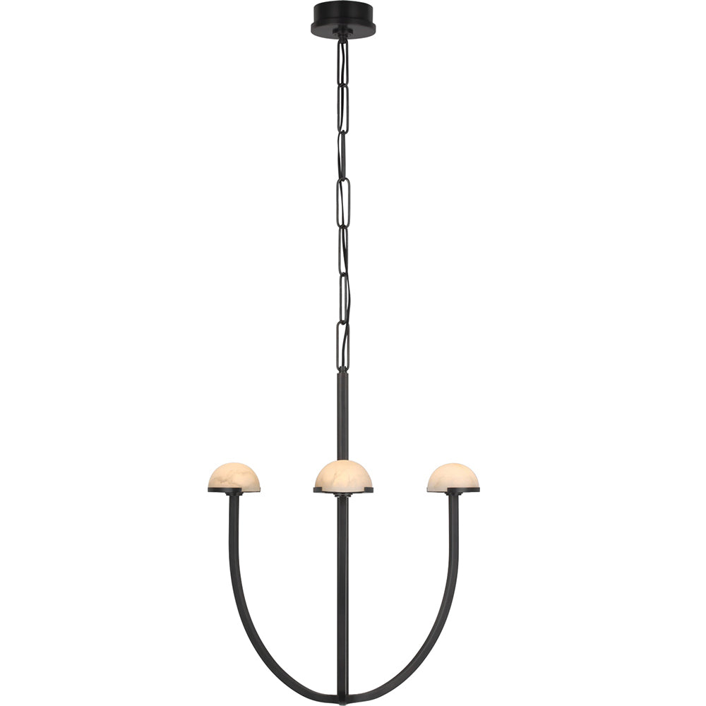 A parallax of dramatically curving silhouettes, the Pedra Medium Chandelier is the paradigm of versatile ambiguous design. This hanging chandelier features hand-carved domes of natural Alabaster accentuated by curvilinear arms of Antique Burnished Brass, Bronze or Polished Nickel, all suspended by a matching custom-link metal chain.