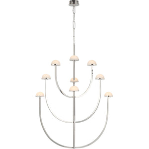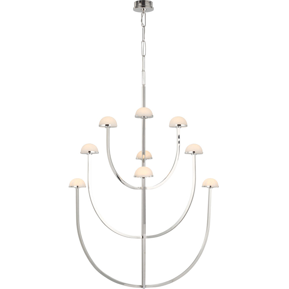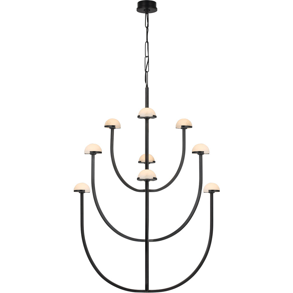 A parallax of dramatically curving silhouettes, the Pedra X-Large Three-Tier Chandelier is the paradigm of versatile ambiguous design. This hanging chandelier features hand-carved domes of natural Alabaster accentuated by curvilinear arms of Antique Burnished Brass, Bronze or Polished Nickel, all suspended by a matching custom-link metal chain.