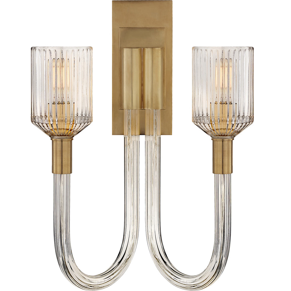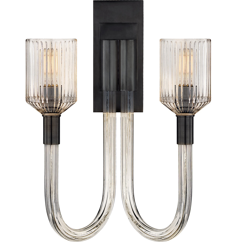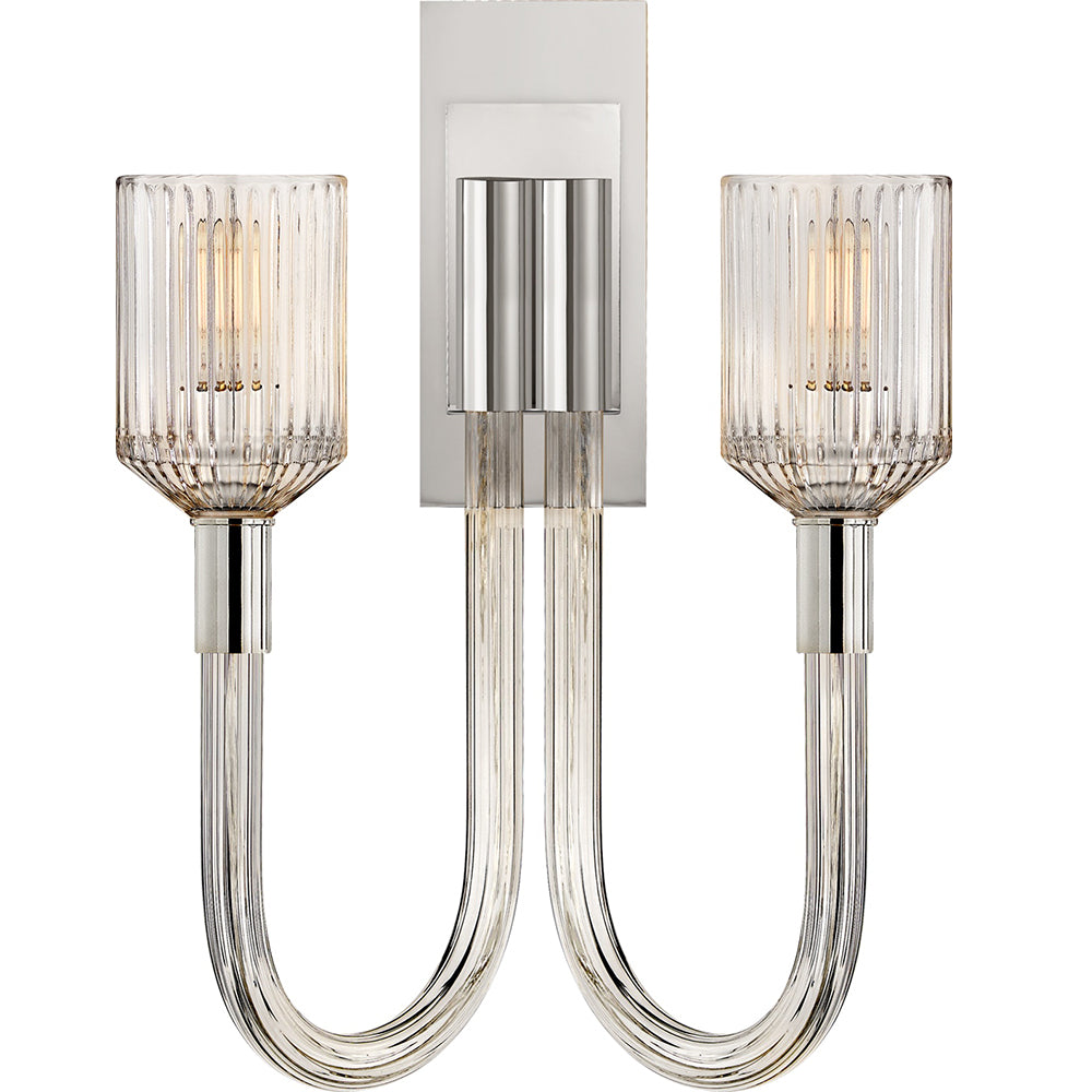 This large double sconce features sinuous arms in gorgeous ribbed glass with fluted glass shades holding two candelabra base bulbs. The artisanal glass treatment combined with a sweeping architecture give this collection a classic elegance.