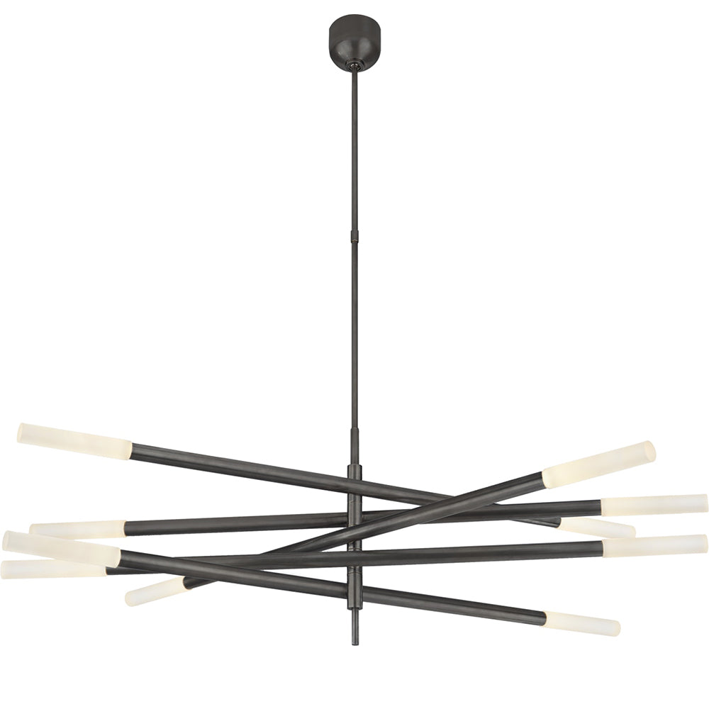 The Rousseau Grande Ten Light Articulating Chandelier by Kelly Wearstler is an iconic convergence of modern design and minimalist form. This rotational Rousseau Grande Ten Light Articulating Chandelier by Kelly Wearstler is available in Burnished Brass, Bronze or Polished Nickel with Etched Crystal lenses and is rated for damp locations.