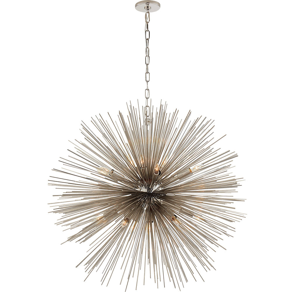 The Strada Large Round Chandelier by Kelly Wearstler brings a mid-century modern flair to your living space, featuring an array of thin metal rods that extend from a central spherical hub. Exposed lamping hides within the partially transparent structure which gives its warm radiance a decorative, glistening quality. An ideal statement-making piece for wide open spaces.