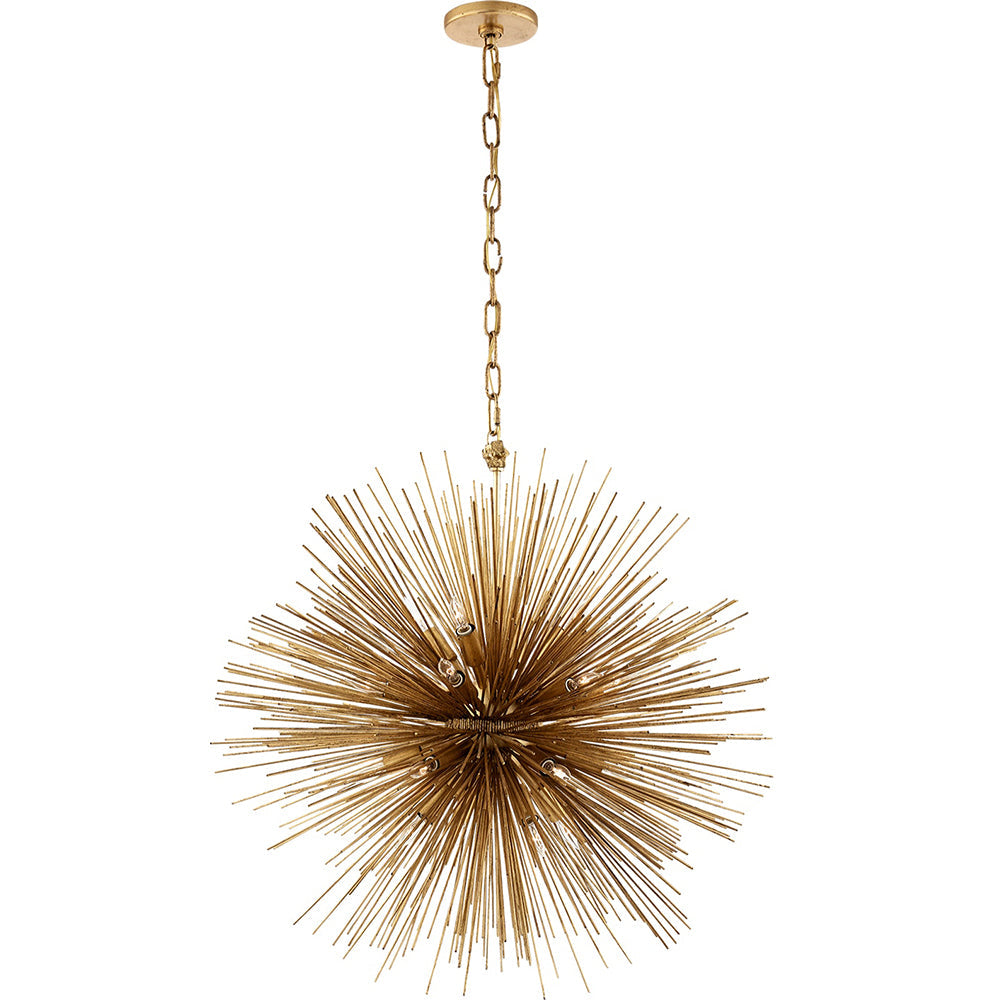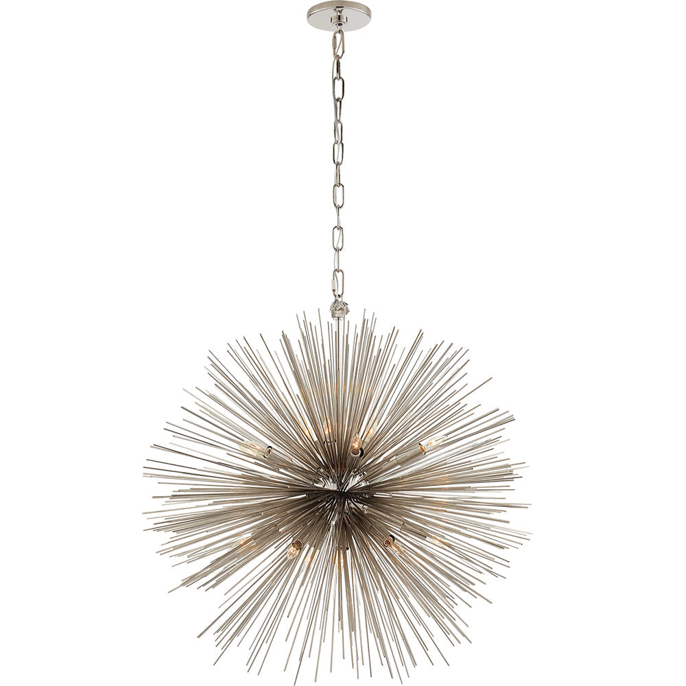 The Strada Medium Round Chandelier by Kelly Wearstler brings a mid-century modern flair to your living space, featuring an array of thin metal rods that extend from a central spherical hub. Exposed lamping hides within the partially transparent structure which gives its warm radiance a decorative, glistening quality. An ideal statement-making piece for wide open spaces.