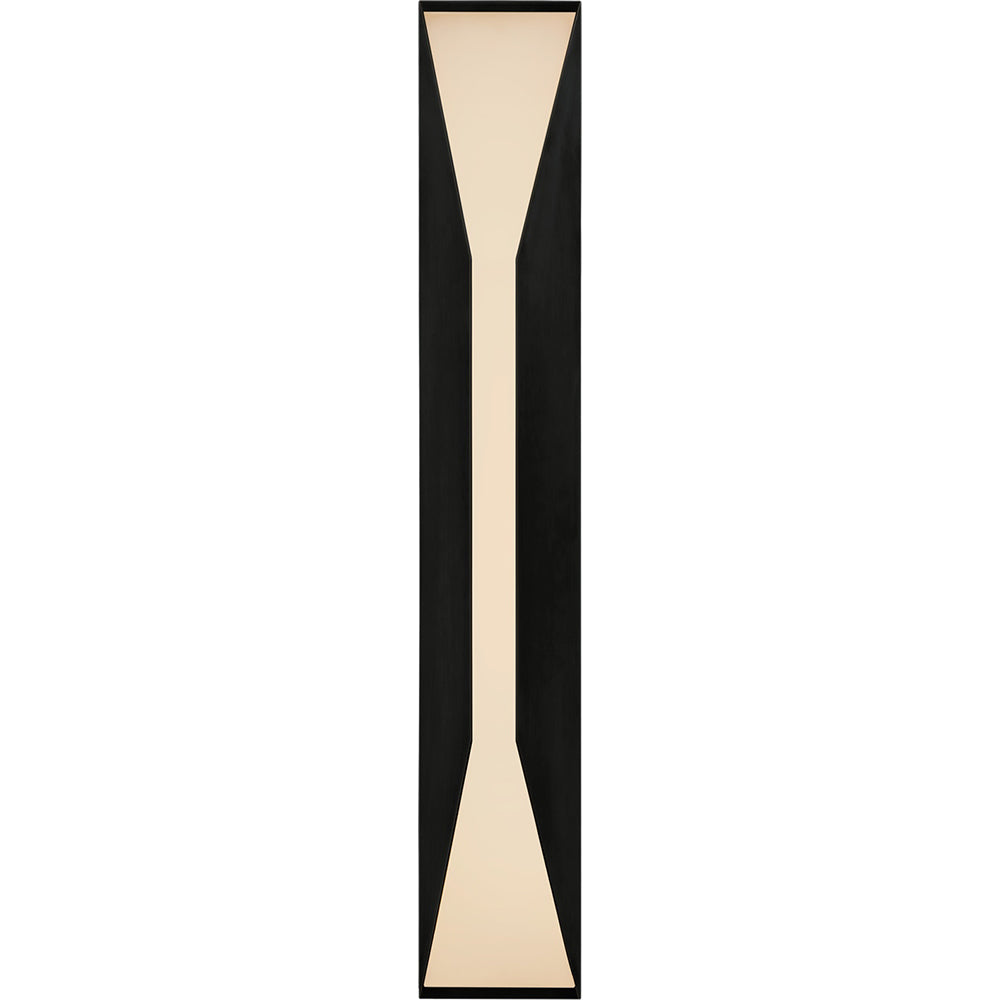 Stretto 28" Sconce by Kelly Wearstler sets a tone of sophistication in one's home through refined, angular design. The piece is framed by the rectangular silhouette of its metal backplate. Inward facing trapezoid shapes make up the housing, adding a clear sense of depth and form to the overall construction. A seamless plane of frosted glass stands out as a graphic outline both off and on. When turned on LED light funnels through the defined edges of the diffuser, producing a shapely ambient glow.