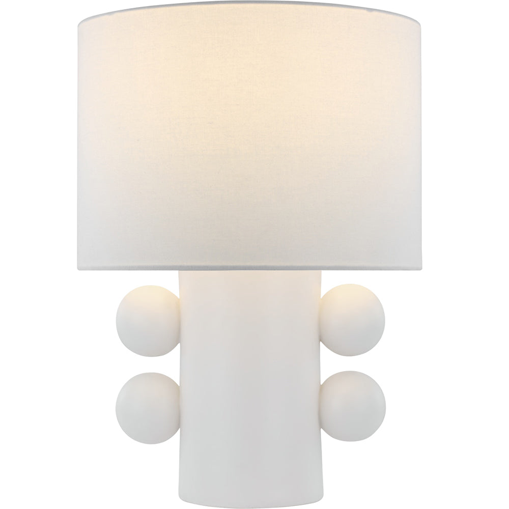 With its vertical score of sculptural spheres on a minimalistic cylinder base, the Tiglia Low Table Lamp is a sophisticated contrast of both artful form and function. This small table lamp features an overlapping linen shade and is offered in either a Black ceramic or White Plaster ceramic finish.