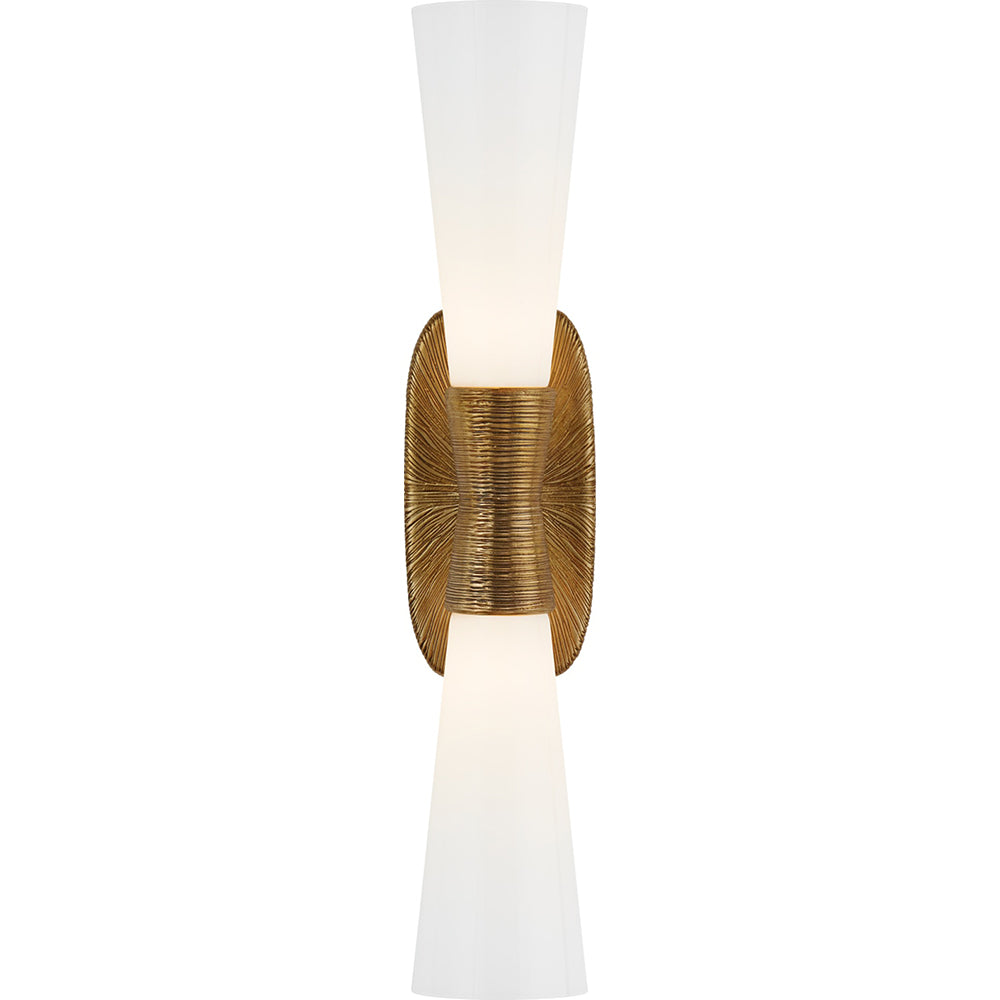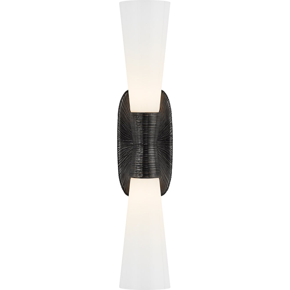 The unique texture and finishes of the Utopia Large Double Bath Sconce by Kelly Wearstler bring an element of interest while remaining versatile enough for a variety of styles and homes. It's repeating, outburst pattern and funneled white glass elevate any space with form and function.