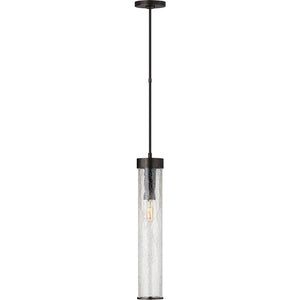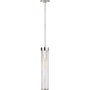 This cylindrical pendant light features our signature crackle glass housing a single candelabra base bulb. The crackle glass shade is framed in brass and hangs from a brass canopy. The mix of clean and raw finishes give this pendant a distinct modern feel. Liaison Long Pendant by Kelly Wearstler is available in Antique Burnished Brass, Bronze, and Polished Nickel with Crackle Glass.