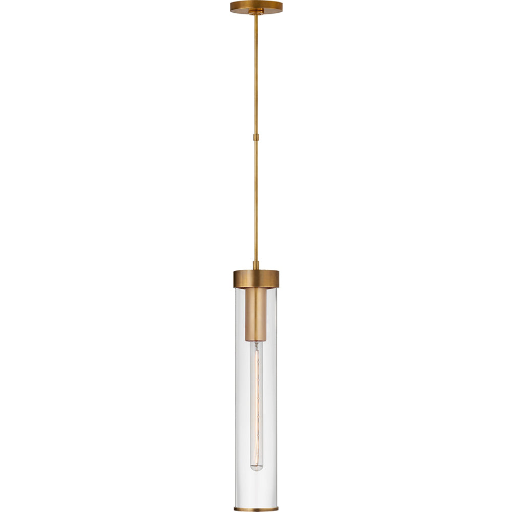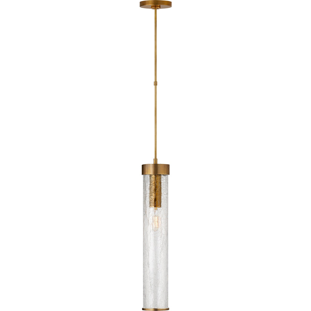This cylindrical pendant light features our signature crackle glass housing a single candelabra base bulb. The crackle glass shade is framed in brass and hangs from a brass canopy. The mix of clean and raw finishes give this pendant a distinct modern feel. Liaison Long Pendant by Kelly Wearstler is available in Antique Burnished Brass, Bronze, and Polished Nickel with Crackle Glass.