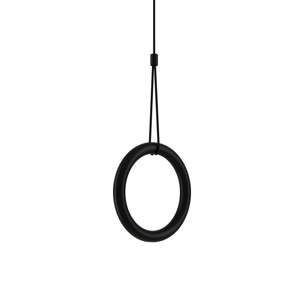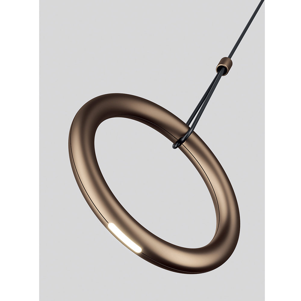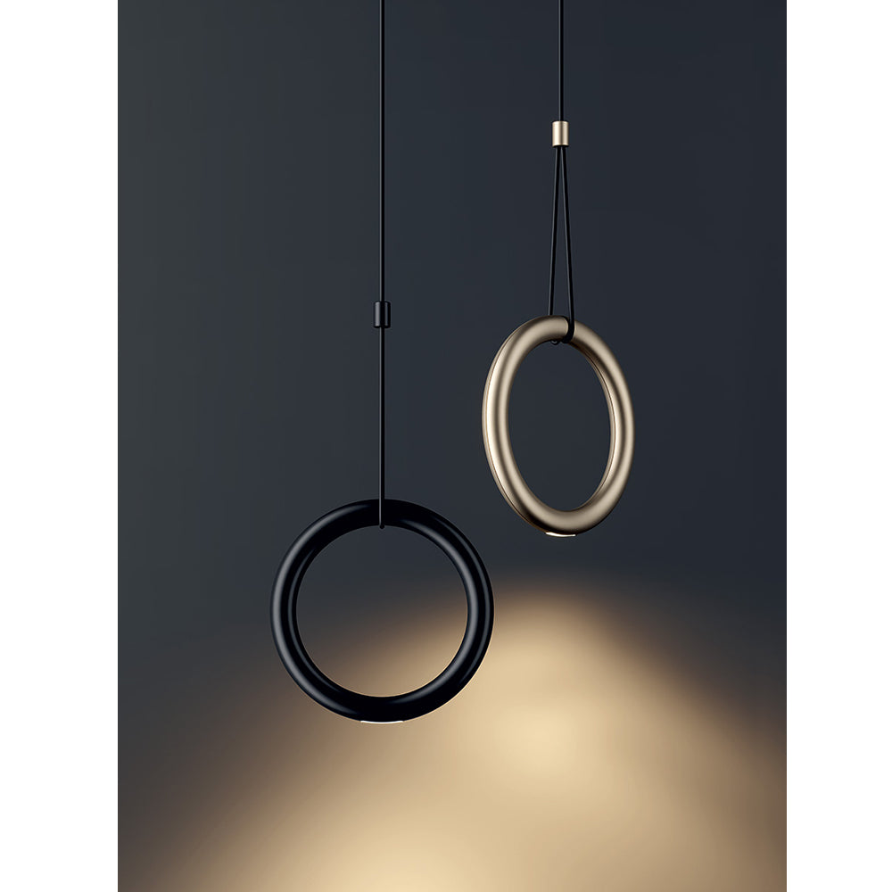 IVY is a minimal, geometric lighting piece composed of a ring hanging on a cable, which gives power to a made to measure LED module. Designed with single and double cables (IVY I and IVY V respectively), IVY responds to the need for flexibility, an increasingly contemporary theme in architectural practice and restoration, allowing the luminaire to be released from its ceiling derivation. The name IVY relates to the clustering of lamps on numerous cables that are reminiscent of climbing branches. The cables intertwine and overlap in the same way as the plant ivy, adapting to the environment and framing certain details of the space. The composition emphasises various focal points from different or changing points of view of those who walk through the room. The design was also inspired by rings, specifically wedding rings, as pendants on necklaces. This motif translates to the ring’s position on the double cable, reinforcing it as a simple yet precious object, making the perfection of its form the value. IVY I is a single pendant lamp with a single cable supporting the ring, which can be used on its own or in compositions on Lodes canopies. IVY V, on the other hand, opens new territory with its new canopy. IVY V IVY is a minimal, geometric lighting piece composed of a ring hanging on a cable, which gives power to a made to measure LED module. Designed with single and double cables (IVY I and IVY V respectively), IVY responds to the need for flexibility, an increasingly contemporary theme in architectural practice and restoration, allowing the luminaire to be released from its ceiling derivation. The name IVY relates to the clustering of lamps on numerous cables that are reminiscent of climbing branches. The cables intertwine and overlap in the same way as the plant ivy, adapting to the environment and framing certain details of the space. The composition emphasises various focal points from different or changing points of view of those who walk through the room. The design was also inspired by rings, specifically wedding rings, as pendants on necklaces. This motif translates to the ring’s position on the double cable, reinforcing it as a simple yet precious object, making the perfection of its form the value. IVY I is a single pendant lamp with a single cable supporting the ring, which can be used on its own or in compositions on Lodes canopies. IVY V, on the other hand, opens new territory with its new canopy. IVY V features a double cable which forms a V by hanging the cable from the power source in the ceiling to wherever users decide to fix it. IVY V can also be used on a new multiple canopy that consists of a base with a central hole from which up to 6 or 12 cables hang. Users can create several V shapes, starting from the canopy and positioning the cable wherever they want around the room, securing it to the ceiling through a small black metal element. The cable is black, while the die-cast zinc alloy ring comes in three finishes: matte black, extra-matte champagne and terra. IVY sheds light downward through a long and narrow opening, which has been skilfully designed to disseminate an even, rounded beam through its methacrylate diffuser. IVY is a true space architecture project, with the cables becoming a graphic sign that defines the space. a double cable which forms a V by hanging the cable from the power source in the ceiling to wherever users decide to fix it. IVY V can also be used on a new multiple canopy that consists of a base with a central hole from which up to 6 or 12 cables hang. Users can create several V shapes, starting from the canopy and positioning the cable wherever they want around the room, securing it to the ceiling through a small black metal element.