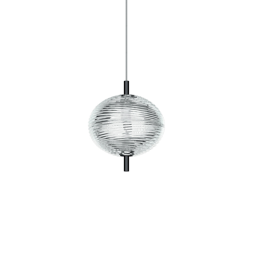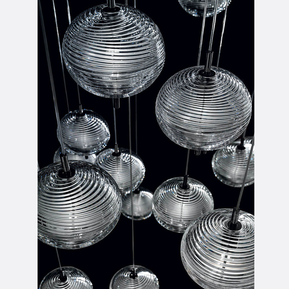 The Jefferson suspension lamp designed by Luca Nichetto is reminiscent of music and iconic images in psychedelic works of art from the 1960s. The vortex motif decorating the diffuser is embellished by the timeless classicism of Bohemian crystal, which diffuses evocative atmospheres of light. Dynamic in its many sizes and multiple compositions, Jefferson’s elegance keeps up with the excellent performance of LED interior lighting. Designed by Luca Nichetto, Jefferson is a suspension lamp in precious Bohemian crystal inspired by the psychedelic visual arts of the Sixties. The vortex pattern that characterises the surface of the diffuser recalls the artistic movement of the counterculture of the late 1960s and its kaleidoscopic and whirling chromatic patterns, which Jefferson elegantly celebrates in a subtle play of luminous suggestions. Jefferson reinterprets the geometric pattern on Bohemian crystal through a special pressing technique that imprints meticulous details on the transparent surface. Jefferson’s Mini version consists of two elliptical crystal diffusers joined together on a black chrome or golden frame that seems to make the crystal rotate like a spinning top. The addition of cylindrical modules extends the size of the lamp in Small and Medium variants thanks to a simple interplay of joints. Suspended from a thin yet highly resistant cable thanks to the built-in Kevlar reinforcement, Jefferson diffuses a warm and elegant light. It features a 3 W LED module with a Colour Rendering Index (CRI) equal to 90, meaning true colour reproduction. The light developed by the LED source is enhanced by the interplay of reflections between the surface motifs of the crystal and the frame. The different dimensions of Jefferson and the possibility of cluster compositions multiply the dynamics of light and infuse a personal touch to different environments. An evocative combination of form and sign, classicism and innovation, Jefferso represents a refined solution to transform any space into a warm living environment.
