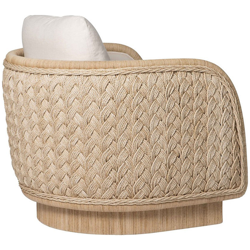 Inspired by nature: the McGuire Coastal Braided Swivel Lounge Chair brings dramatic elements of seaside life to any space. Discover this ultra comfortable McGuire Coastal Braided Swivel Lounge Chair available in Natural Danish cord finish. The materials used in this statement design mimic the textures and materials Kirar found throughout her many travels in the Yucatan peninsula; she borrows weaving concepts and techniques from braided rope and baskets, thatched roofs and other raw materials commonly used in the area. The braided back is handmade from 'Class A' Abaca rope (known for its consistently light finish) in an over scaled pattern; hand wrapped Danish Cord accentuates the base and exposed frame. The sprung base, loose down & feather seat cushions and the swivel base makes this generously scaled McGuire Coastal Braided Swivel Lounge Chair a very comfortable fit.