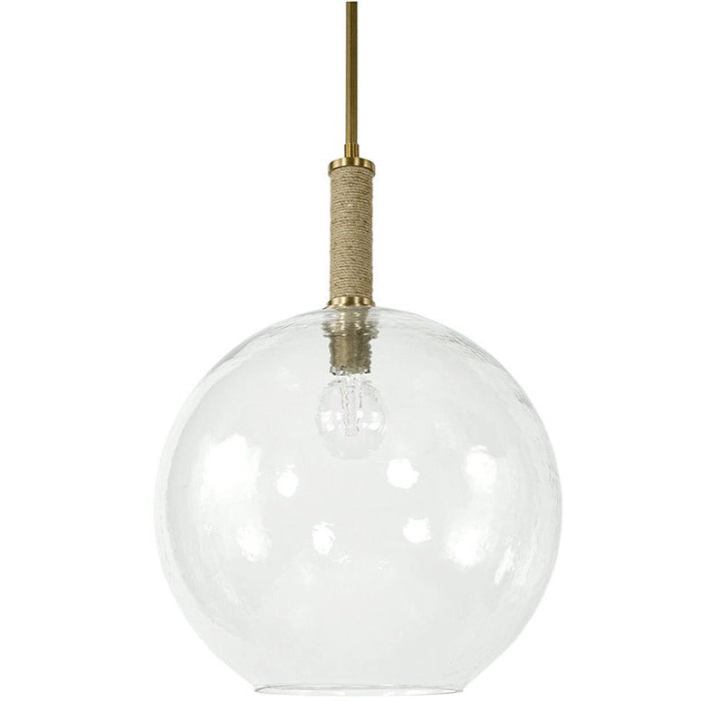 Bring a boost of brightness and a touch of contemporary style to any arrangement with this Palacek Bronson Large Globe Glass Pendant. This Palacek Bronson Large Globe Glass Pendant light makes a statement in your kitchen or foyer with its large clear glass globes and linear design. Kirk Nix collection. Fully adjustable pendant features a hand-blown rippled glass shade accented with natural jute rope. Antique brass or pewter metal finished canopy kit includes 1 x 24" rod, 2 x 12" rods and 1 x 3" rod for customizable hanging heights. We love how its sleek aesthetic makes this light blend with decor styles from contemporary to transitional. A truly dynamic fixture, the Palacek Bronson Large Globe Glass Pendant fits seamlessly amidst most décor styles. Its sleek design and vast offering of finishes and shade options make the Palacek Bronson Large Globe Glass Pendant an easy choice for all homes. Professional installation is recommended.