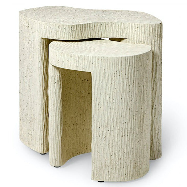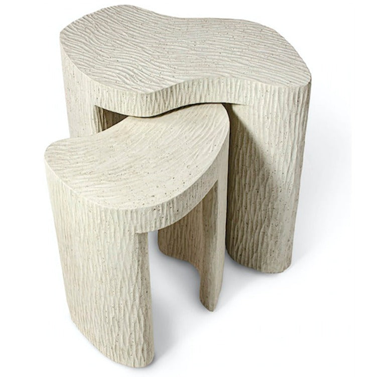 The Nadia Outdoor Side Tables - Set of two by Palecek has a wonderful design. It is a set of two partial nesting tables made of stone composite features an aged white textured finish. Suitable for outdoor use.
