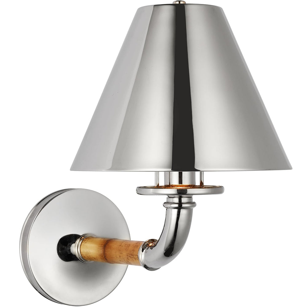 Description: Dalfern Medium Single Sconce in Waxed Bamboo and Polished Nickel with Polished Nickel Shade