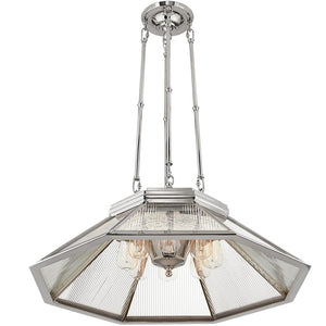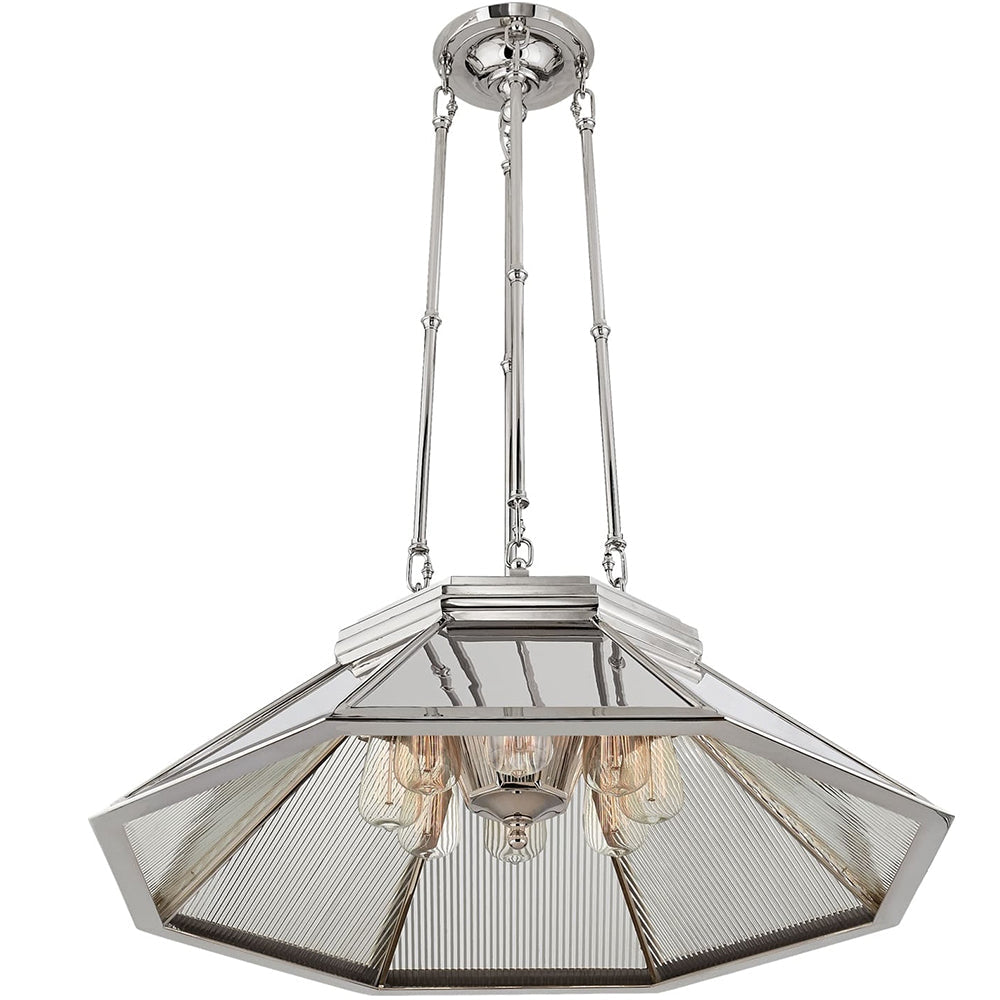 Description: Rivington Medium Eight-Paneled Chandelier in Polished Nickel with Clear Ribbed Glass