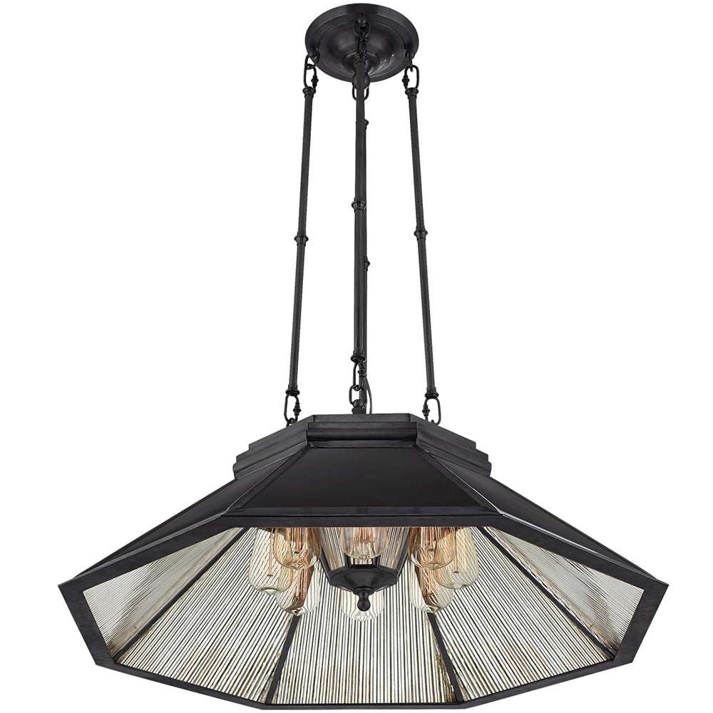 Description: Rivington Medium Eight-Paneled Chandelier in Bronze with Clear Ribbed Glass