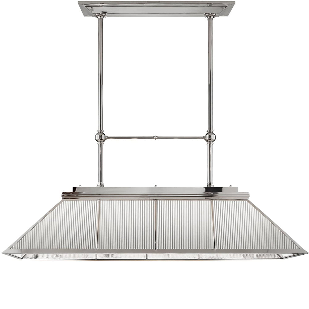 Description: Rivington Large Billiard Chandelier in Polished Nickel with Clear Ribbed Glass