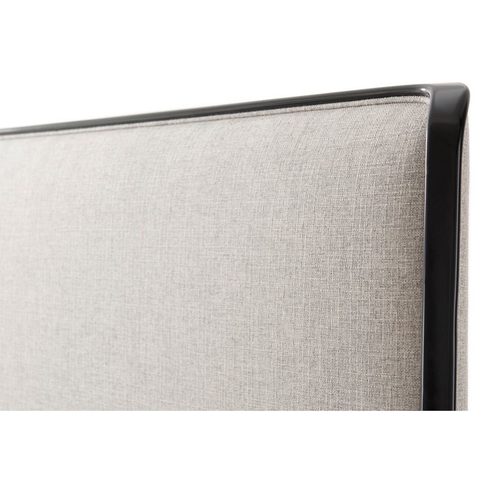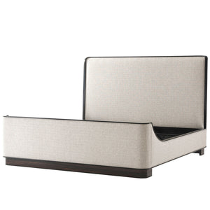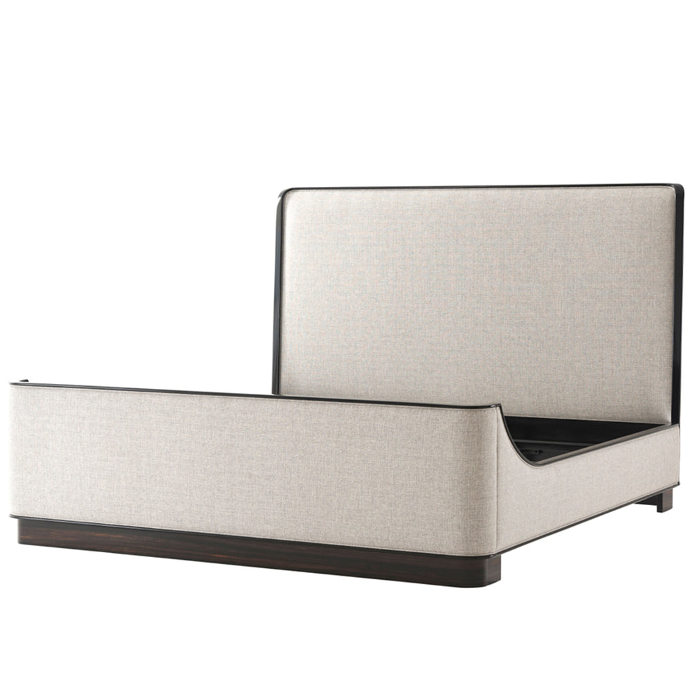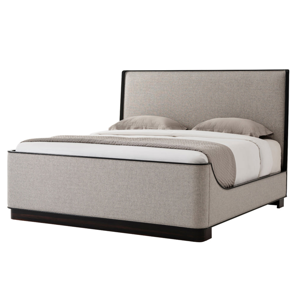 Gently Bowed Upholstered Headboard with Wood Trim. Similar Rails and Footboard. On End Plinth Bases in Amara Veneer. Shown in Ash-UP5410 Fabric; For US King mattress - 76 x 80''/193 x 203cm
