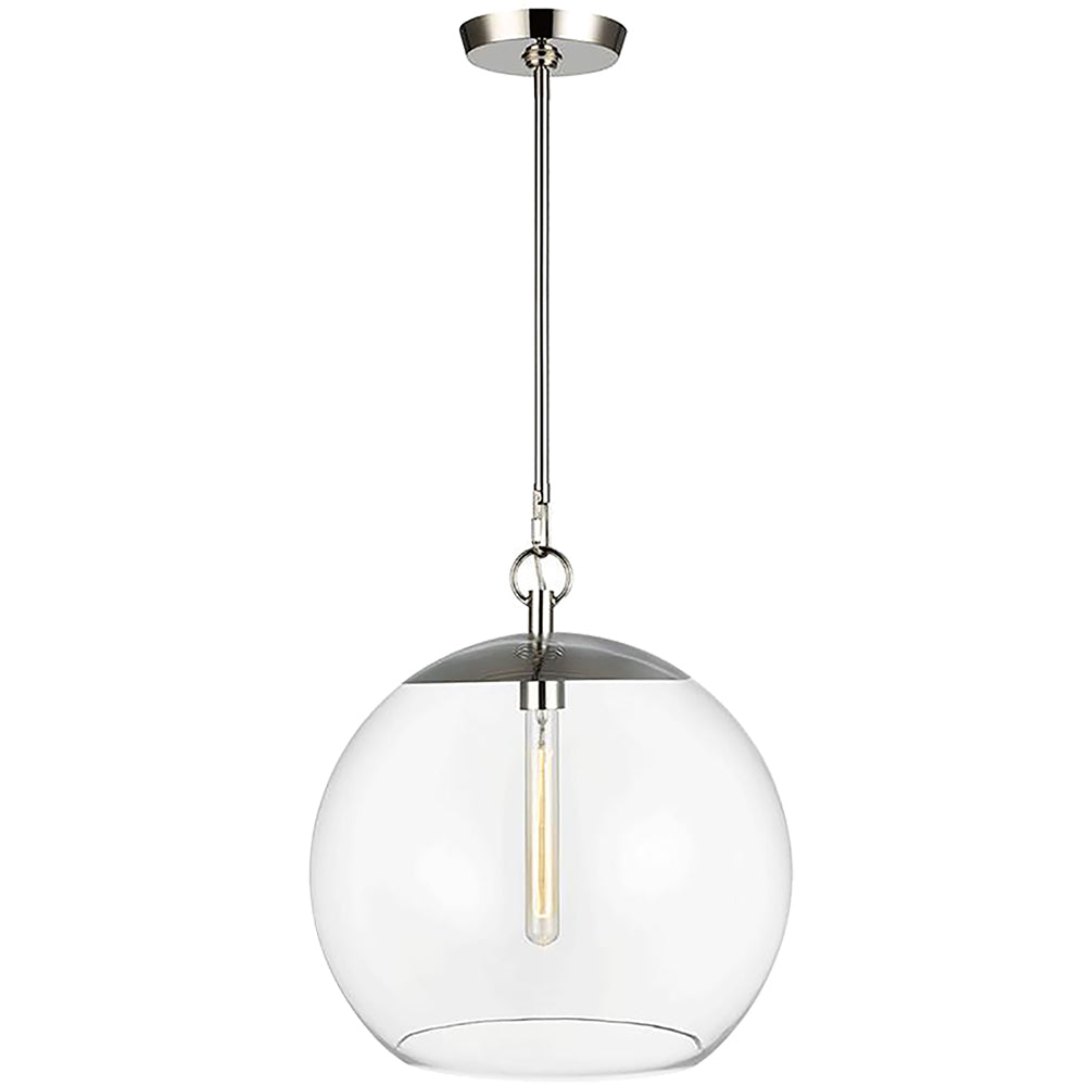 The Atlantic Round Pendant by Visual Comfort has a solid structure. A modern take on classic schoolhouse lighting. Basic geometric forms, sphere and cone, made from clear mouth blown glass. The thick glass shade enhances the light from the bare filament bulb within.