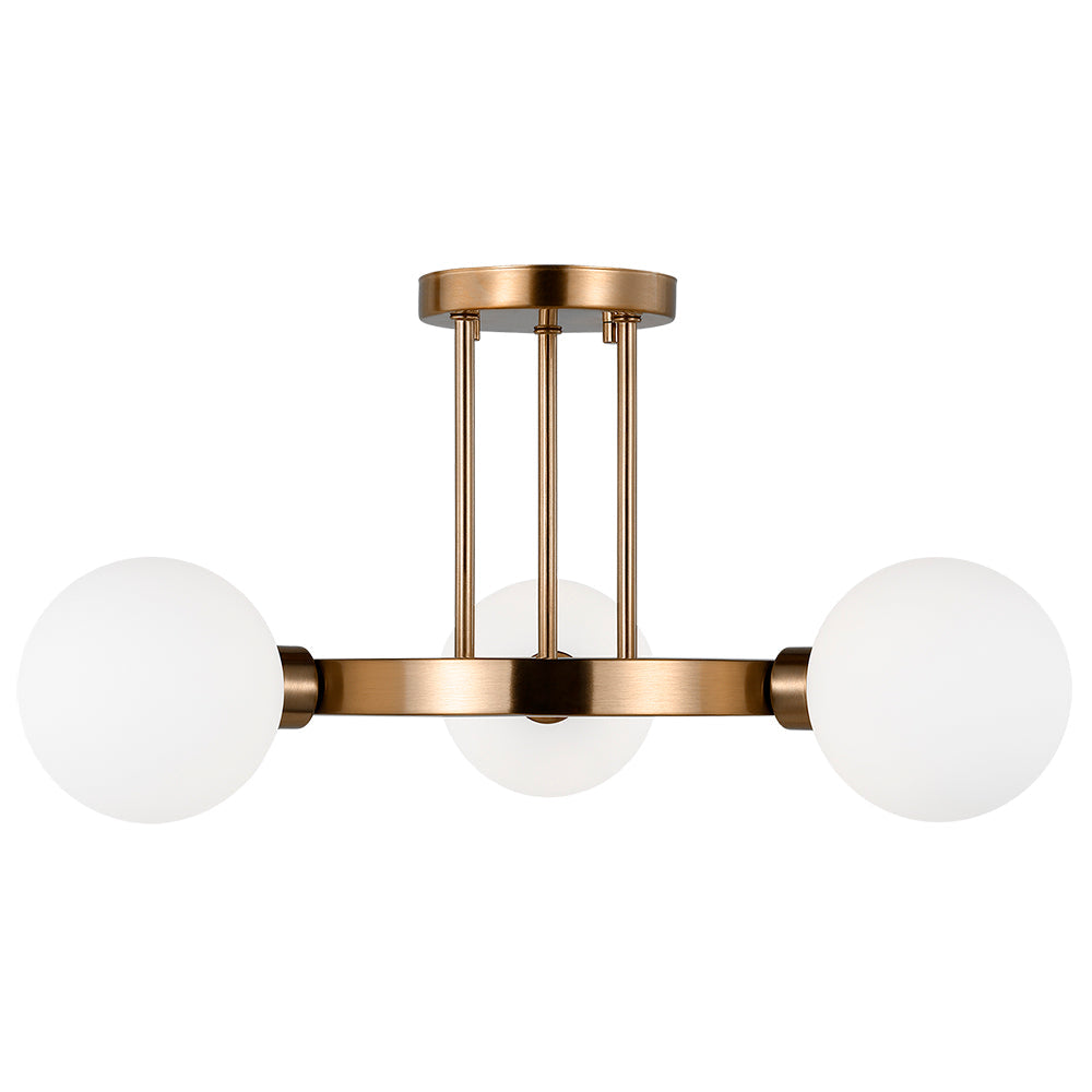 This Clybourn Three Light Semi-Flush Mount features a Sputnik-inspired design and a chic finish to bring a modern glam accent to your entryway, hallway, or bedroom. The fixture is crafted from metal with three short arms pointing in different directions for a symmetrical look. The Clybourn Three Light Semi-Flush Mount fixture in Midnight Black or Satin Brass is an industrial yet minimalist design, making this fixture perfect for an eclectic living room or over a modern dining room table. Milk Glass gives the Clybourn series a more current look. Bring a warm glow and contemporary appeal to any space in your home with this 3-light semi-flush mount. Plus, it's compatible with a dimmer switch, letting you set the mood just how you want it.
