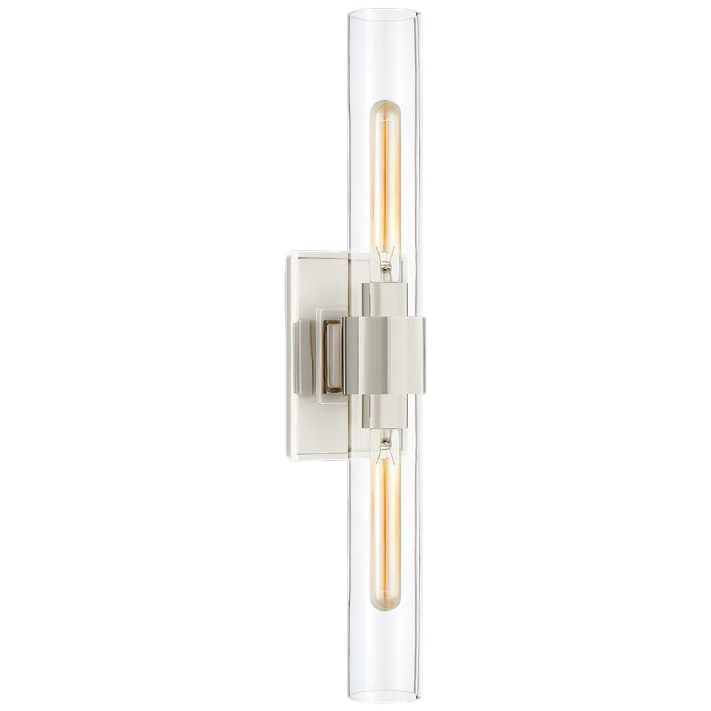 The Presidio Petite Double Sconce is in Bronze, Hand-Rubbed Antique Brass, Polished Nickel with White and Clear glass. It has a rectangular backplate. Inspired by light houses and other nautical elements, these lighting fixtures manage to tie into themes that go beyond coastal. The hand-applied finishes may have subtle variation, making each fixture unique.